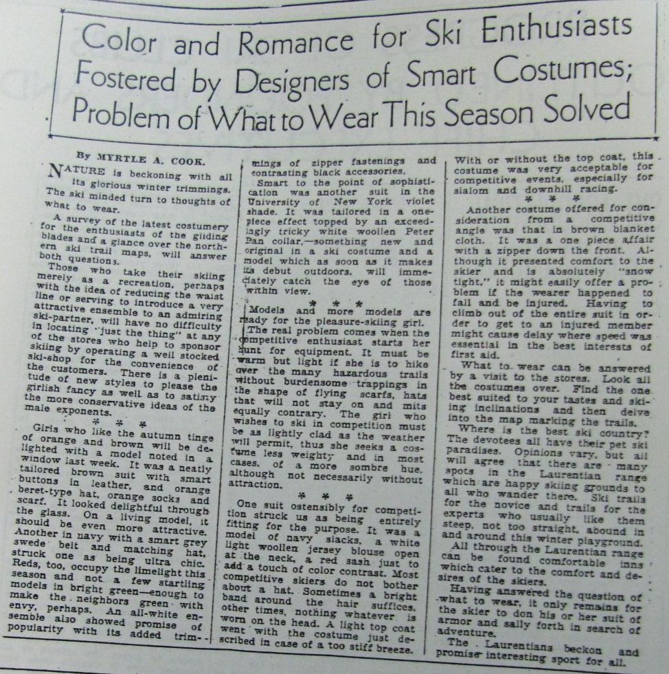 Models and more models are ready for the pleasure-skiing girl. The real problem comes when the competitive enthusiast starts her hunt for equipment. It must be warm but light if she is to hike over the many hazardous trails without burdensome trappings in the shape of flying scarfs, hats that will not stay on and mits (sic) equally contrary. The girl who wishes to ski in competition must be as lightly clad as the weather will permit, thus she seeks a costume less weighty and in most cases, of a more sombre hue, although not necessarily without attraction.