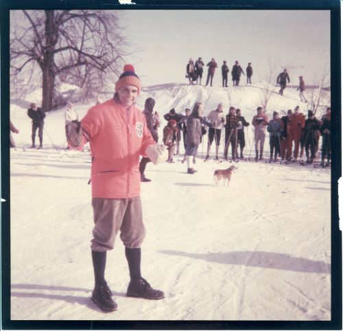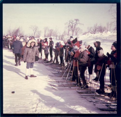 A brown paper bag can be seen in starter Don MacLeod’s left hand. Following is a quote from “Canadian Ski Marathon – its history in story and pictures” written by Bill Pollock: