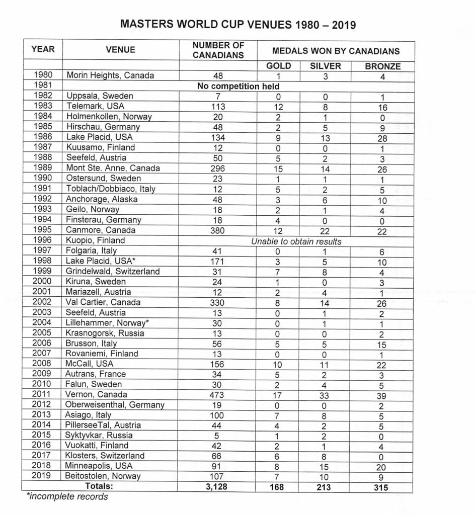 - February 1983 – the event was renamed Masters World Cup and 520 participants from 20 skiing nations took part in the week-long competition at Telemark, Wisconsin, USA.