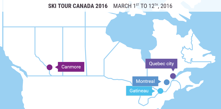 The Ski Tour Canada 2016 – FIS Cross-Country World Cup featured four iconic Canadian ski destinations as host venues. The first week of racing featured four stages in Quebec (Gatineau, Montreal and Quebec City), while the second week featured the final four stages and awarding of the FIS crystal globes in Alberta (Canmore).