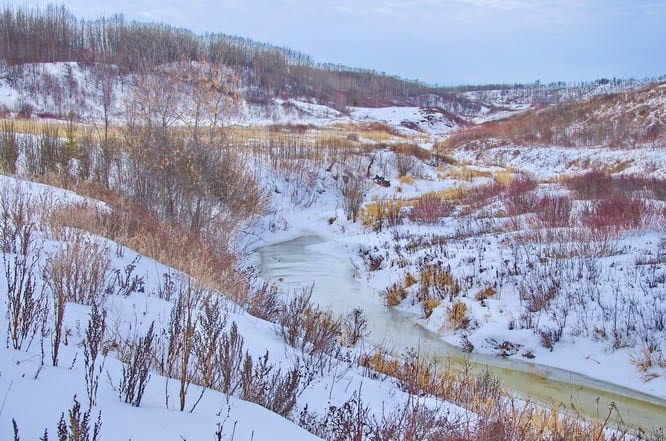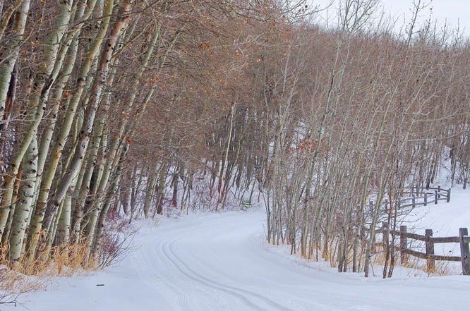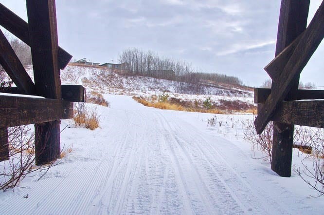 Fortunately the manure pit is long gone. What you’ll find now are approximately 18 kilometres of ski trails following the Stoney Creek Valley. Don’t expect a wilderness feel to the trails that form a loop at the north end. In fact, some lucky residents can ski right out their back door onto the trails. But at the south end, away from the homes, you’re skiing in an area that feels far removed from civilization.