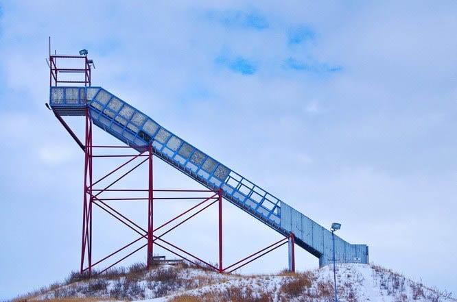Camrose, according to Hazel Cail, Executive Director of Tourism Camrose, has strong Scandinavian roots – so back in the early days skiing and ski jumping was popular with the majority of residents. The original ski jump, built in 1911 is long gone and so is the one lost to a fire in 1921. The present ski jump dates to 1932. As one story goes, there is tell of skiers doing their jumps and one landed far out into the snow and just kept sinking…. right into a pig manure pit from the pig farm existing right next to the ski hill.