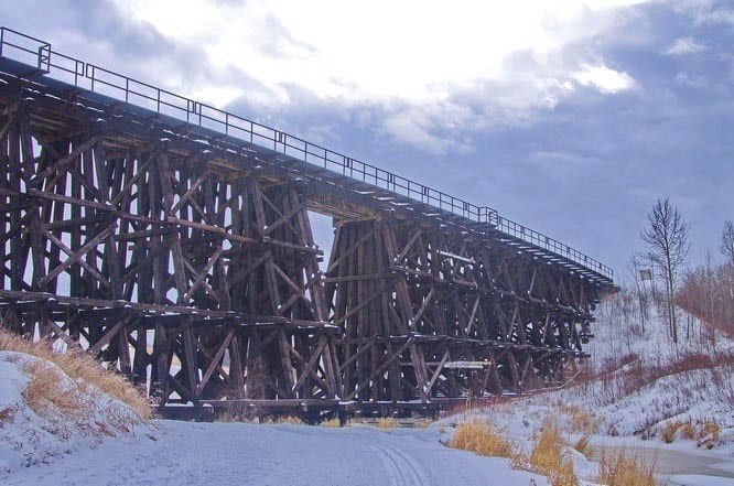 Skiing under a trestle bridge – one that’s still in use today – was one of the highlights of my ski tour. The first was built in 1910 and because of fires, it’s been rebuilt twice. Hazel tells me that at one point up to eight through-passenger trains arrived daily in Camrose from Calgary – along with freight trains.