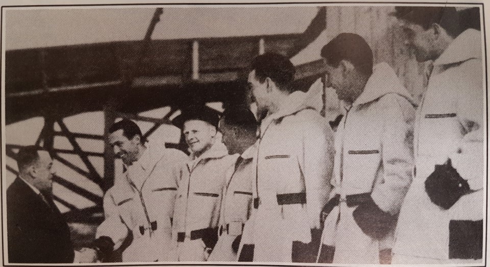 Tormod Mobraaten, third from the left, with Canadian Olympic Ski Team prior to sailing for Germany to attend the 1936 Winter Games in Garmisch-Partenkirchen